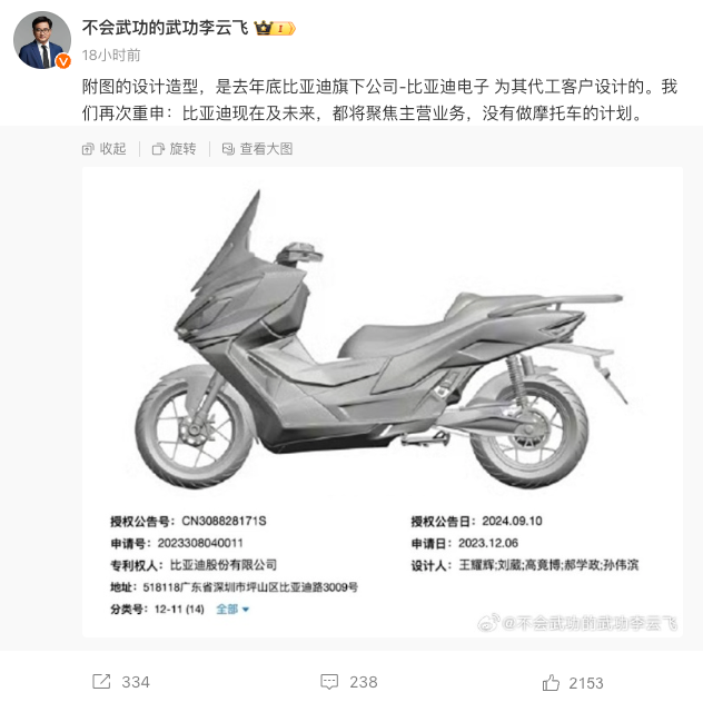 比亚迪李云飞:公司都将聚焦主营业务,没有做摩托车的计划